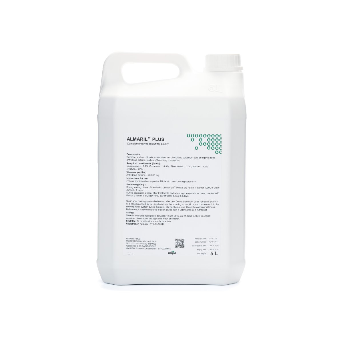 - Dosage and Administration: Diluted in drinking water during 3 to 5 days. 1L of Almaril™ Plus for 1000L of water (1mL/L). Do not give pure