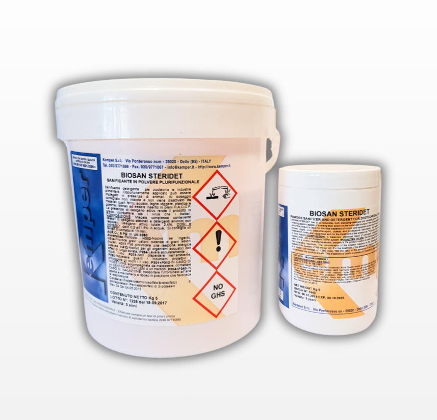 Air treatment : Spray 1 L of BIOSAN STERIDET in diluted aqueous solution 1: 200 for every 100 M3 of volume even in the presence of animals. - Presentation: Pink dry powder in 1 KG Plastic container and 5 KG Plastic Bucket
